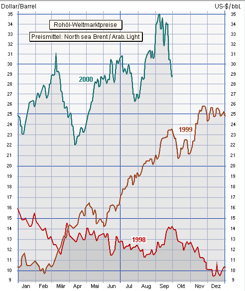 Das „Billig-Benzin“-Argument. 1960 mussten Autofahrer für 1 Liter Benzin noch 14 Minuten arbeiten, heute sind es nur noch 5 Minuten. Nie war der Sprit mithin so billig wie heute.(Lassen Sie sich nicht foppen von Neunmalklugen, die sie glauben machen wollen, in weiteren 10 Jahren müsse man dann wohl nur noch 3 Minuten arbeiten, in 20 Jahren nur noch eine Minute ....). Das „Marginalitäts“-Argument. Der hohe Benzinpreis mag ärgerlich sein – die Ursache liegt aber im Rohölpreis, der sich verdreifacht hat auf nunmehr 30$ pro Fass, bei gleichzeitigem Werteschwund des Euro gegenüber dem Dollar. Die paar Pfennige Ökosteuer stellen dabei eine zu vernachlässigende Größe dar. Empfehlung: Zahlen ohne murren.(Kleine Pikanterie am Rande: Staunend muss der Scheich gewahren, dass das Fass, welches ihm statt früher 10 heute 30 § einbringt, den Finanzministern der Abnehmerländer nun zirka 70 $ statt früher 25$ in die Kassen spült. Da mag der Scheich wohl ins Grübeln kommen.) Das „Öko“-Argument. Steuern steuern – was steuern sie? In diesem Fall natürlich den Sprithunger des Verbrauchers. Durch berechenbare, fortlaufende und vertretbare Steigerungen der Steuern soll Energie so verteuert werden, dass ein verantwortungsvoller Ge-und Verbrauch der kostbaren Ressourcen möglich wird (A.Merkel: ökologischer Umbau des Steuersystems; allerdings geäußert vor dem Erwerb des Parteivorsitzes). |