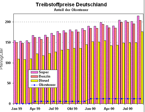 Die in den letzten Wochen stattgefundene Propaganda gegen die Ökosteuer und damit gegen die begonnene Ökologische Steuerreform ist eine Propaganda wider besseres Wissen: Die Grafiken zeigen den Anteil der Ökosteuer an der Entwicklung der Treibstoff- und Heizölpreise und die Entwicklung der Rohöl-Weltmarktpreise. Steffmann, Hannover