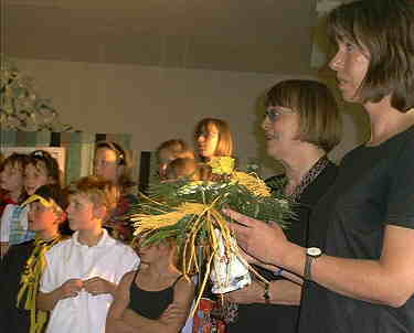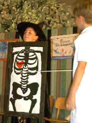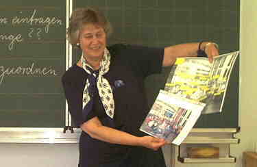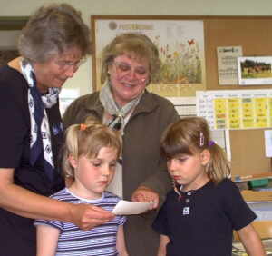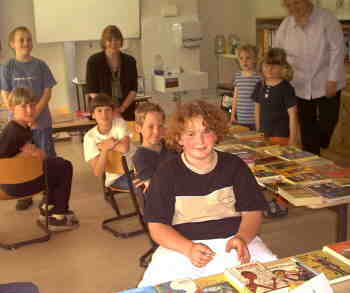 Florian Volz und Lena Ehrhardt spielen einen Schüler und eine Schülerin in der Rahmenhandlung des Musicals Diese vom Leineblick besuchte Vorstellung war Teil der Veranstaltung „Tag der offenen Tür“, bei der die Grundschule Frielingen für Eltern und Großeltern, ehemalige Schüler und interessierte Bürger ihre Tore öffnete, um Einblicke in ihre schulische Arbeit zu geben. Schüler der Klasse 4a beim Verkauf alter Bücher Mit dieser Veranstaltung hat die Grundschule Frielingen die Feierlichkeiten zur 650-Jahrfeier erfolgreich eingeleitet. Die beiden für das Musical verantwortlichen Lehrerinnen Ute Coltzau (links) und Heike Obermeywer. |